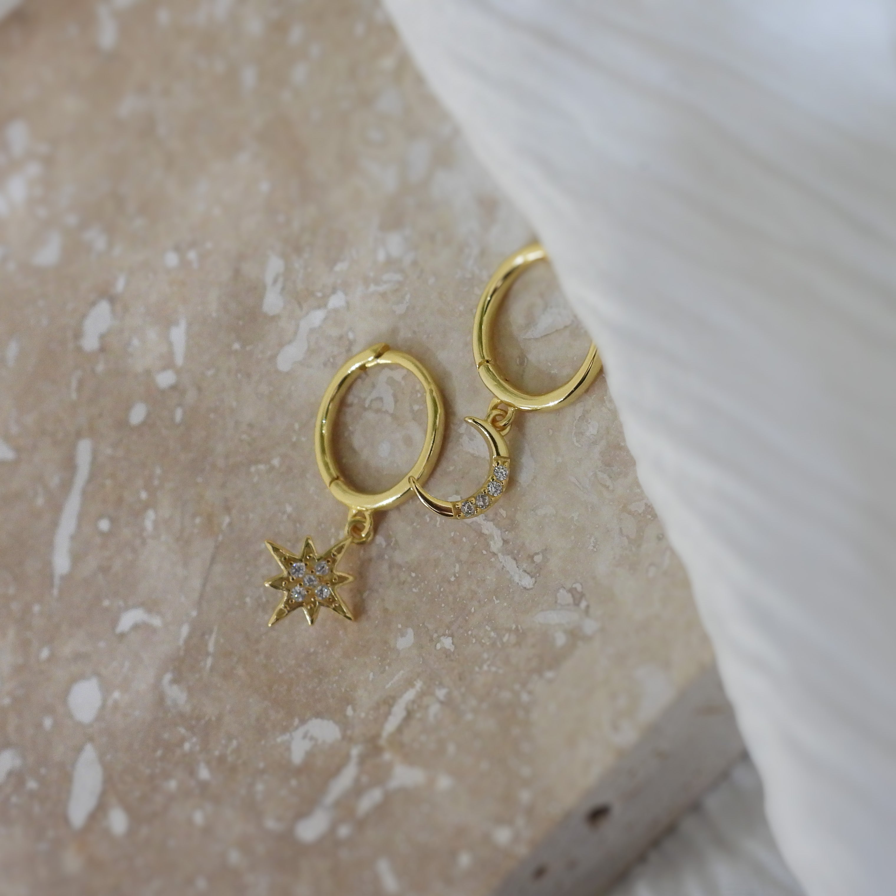 Experience the enchanting beauty of the cosmos with our Celestial Moon & Star Hoops. These cubic zirconia set charms evoke the celestial magic of the night sky. On hinged huggie hoop you can effortlesly elevate you daily style.