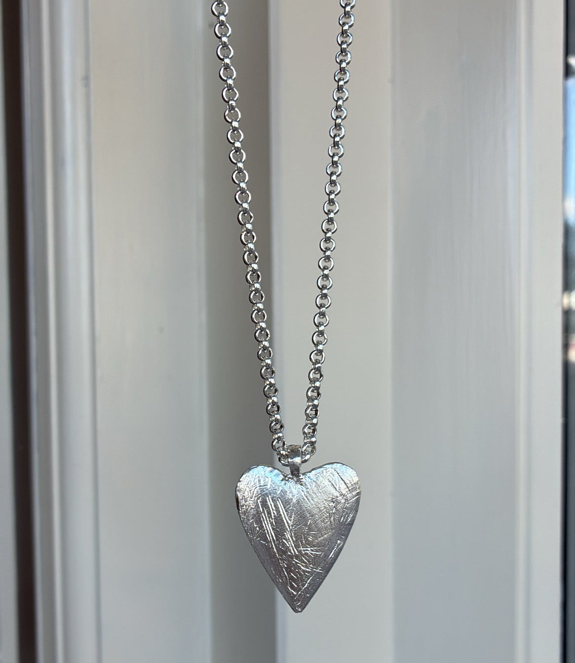 Heart-shaped silver necklace on a red card held by a hand, with a blurred indoor background.